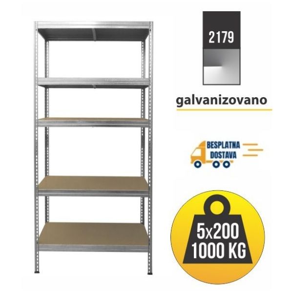 Polica ima 5 nivoa, a svaki nosi 200kg. Ukupna nosivost je 1000kg. Metalni deo police čine stubici u L profilu 30x30mm sa duzinskom perforacijom. Perforacija omogucava proizvoljno podesavanje raspona izmedju nivoa police.