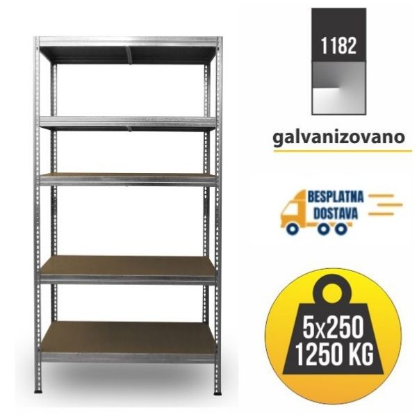 Polica ima 5 nivoa, a svaki nosi 250kg. Ukupna nosivost je 1250kg. Metalni deo police čine stubici u L profilu 30x30mm sa duzinskom perforacijom. Perforacija omogucava proizvoljno podesavanje raspona izmedju nivoa police.