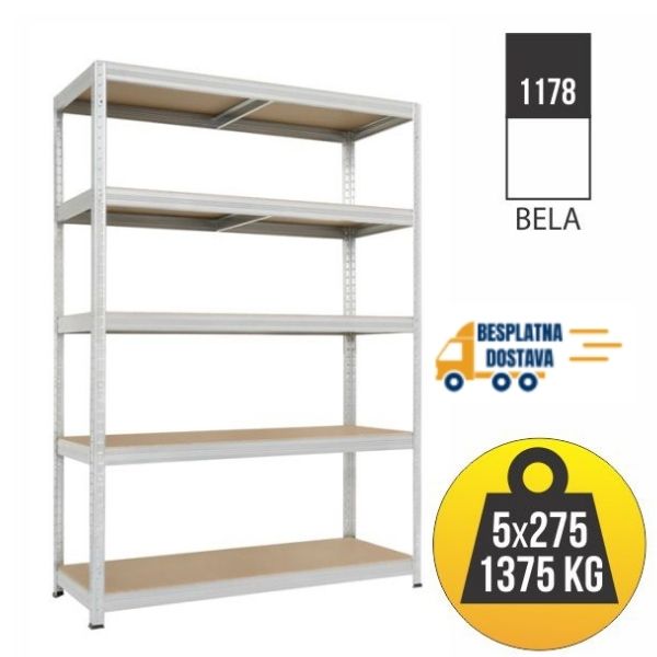 Polica ima 5 nivoa, a svaki nosi 275kg. Ukupna nosivost je 1375kg. Metalni deo police čine stubici u L profilu 30x30mm sa duzinskom perforacijom. Perforacija omogucava proizvoljno podesavanje raspona izmedju nivoa police.